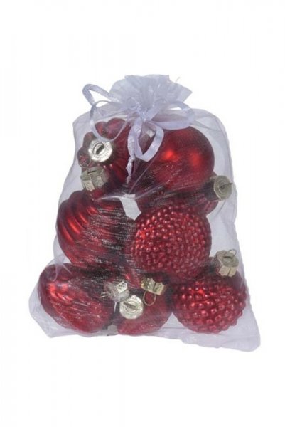 - sada 10 menších skleněných ozdob různých tvarů a odstínů v červené barvě se stříbrnou