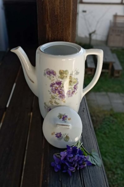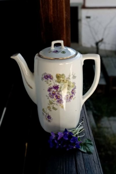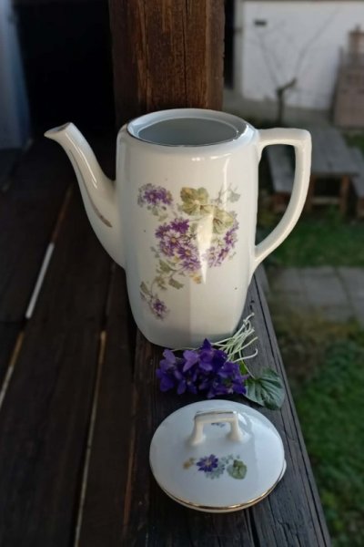 - krásná porcelánová konvička je zdobena květy v barvě lila se žlutými středy a sv. zelenými